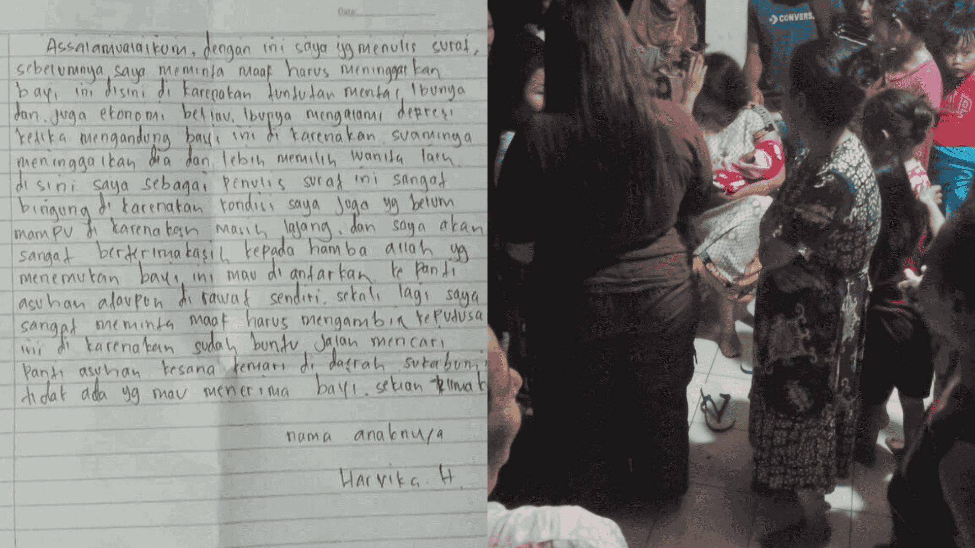 Dalam surat tersebut penulis mengaku terpaksa meninggalkan bayi yang diberi nama Harvika itu karena kondisi mental ibunya yang depresi dan himpitan ekonomi.