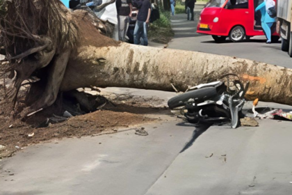 CORONGSUKABUMI.com β Sebuah pohon tumbang di Jalan Situgunung Km 5, Kadudampit, Kabupaten Sukabumi, menimpa sepeda motor yang sedang melintas pada Sabtu (24/1/2026) sekitar pukul 14.20 WIB. Kejadian i...