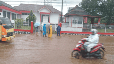 CORONGSUKABUMI.com – Hujan deras yang mengguyur wilayah Sukalarang, Kabupaten Sukabumi, pada Jumat (17/4/2026) sore kembali memicu banjir di ruas jalan nasional penghubung Sukabumi–Cianjur. Genangan air bercampur lumpur dan material lainnya sempat menghambat arus kendaraan di kilometer 11 jalur tersebut.