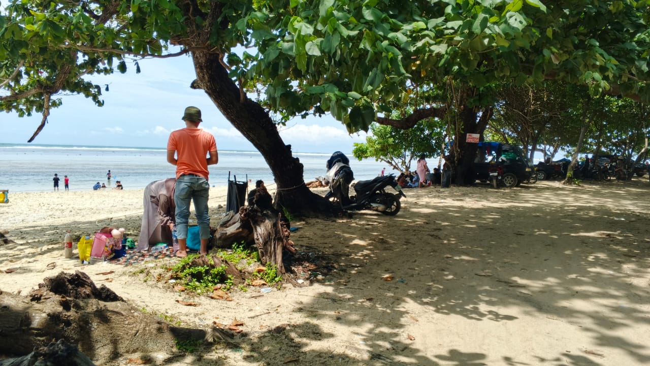 “Disini kita bisa menikmati pantai yang sebagus ini, dan untuk berenang anak-anak juga kita tidak takut karena dipinggiran ini airnya sangat dangkal dan tidak ada ombak, apalagi kalo panas gini, kita bisa berteduh di bawah pohon sambil melihat ke pantai,” ujarnya.