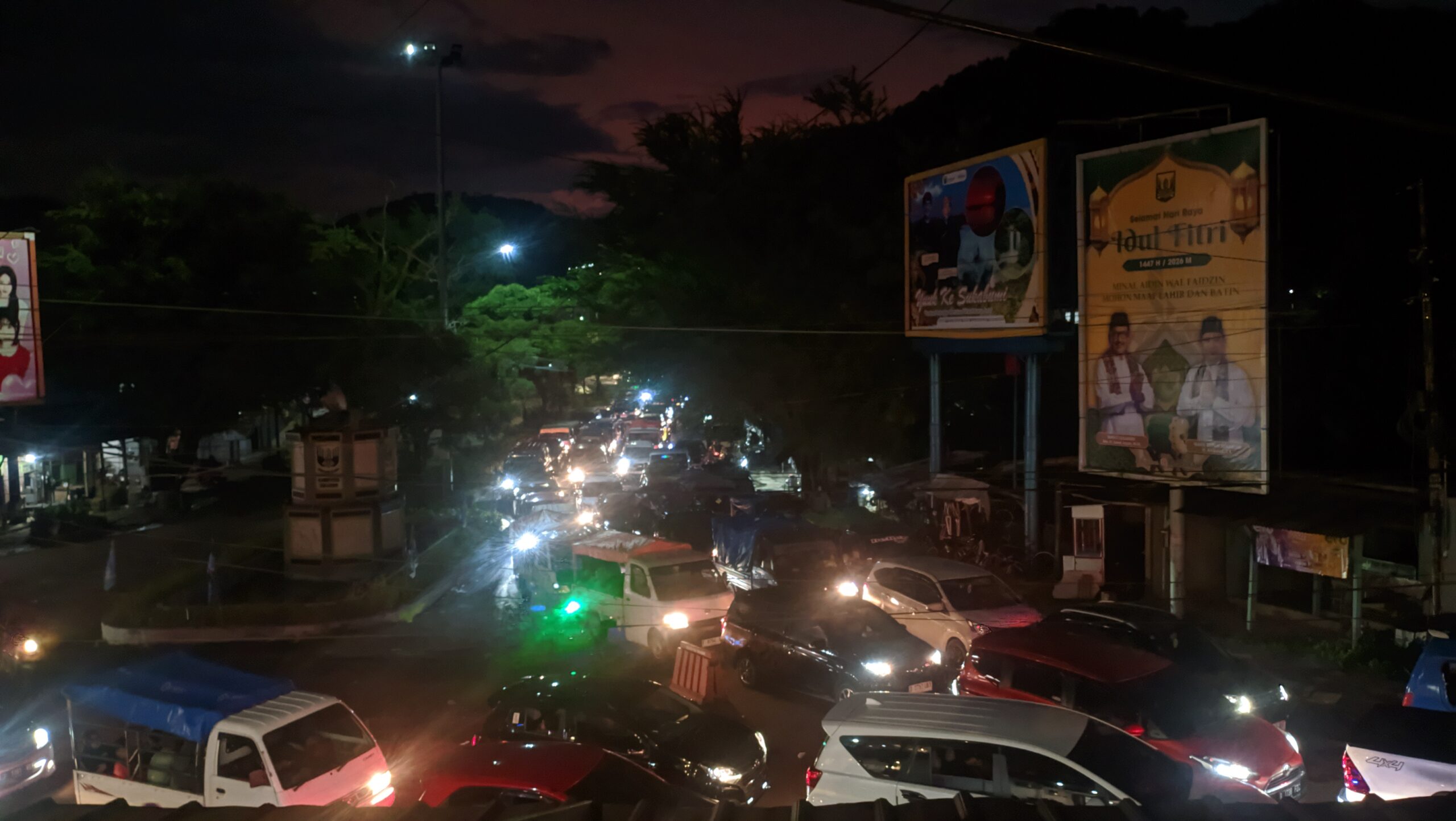 Memasuki malam hari sekitar pukul 21.00 WIB, kondisi lalu lintas mulai berangsur normal. Kendaraan masih terlihat mengantre, namun pergerakan sudah lebih lancar dibandingkan pada sore hari.