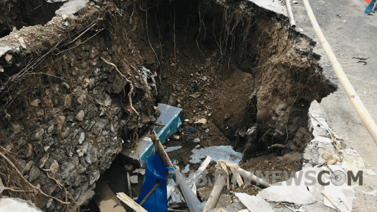 Lubang tersebut ternyata merupakan tanah amblas akibat jebolnya saluran air bawah tanah yang tergerus aliran deras setelah hujan. Struktur beton di permukaan kehilangan penopang dan akhirnya runtuh bersama material di sekitarnya.