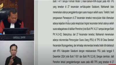 JUBIRTVNEWS.COM – Mahkamah Konstitusi (MK) menolak gugatan terkait Perselisihan Hasil Pemilihan Umum (PHPU) pada Pilkada Kabupaten Sukabumi Tahun 2024 yang diajukan oleh Pasangan Calon Bupati dan Wakil Bupati Nomor Urut 1, Iyos Somantri dan Zainul.