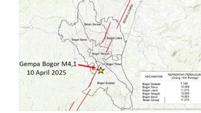 Gempa Bogor dengan kekuatan M4,1 yang terjadi pada 10 April 2025 pukul 22.16 WIB merupakan jenis gempa tektonik kerak dangkal dengan kedalaman hiposenter hanya 5 km. Episenter gempa terletak di Kota Bogor pada koordinat 6.62 LS dan 106.8 BT, tepat di jalur Sesar Citarik.