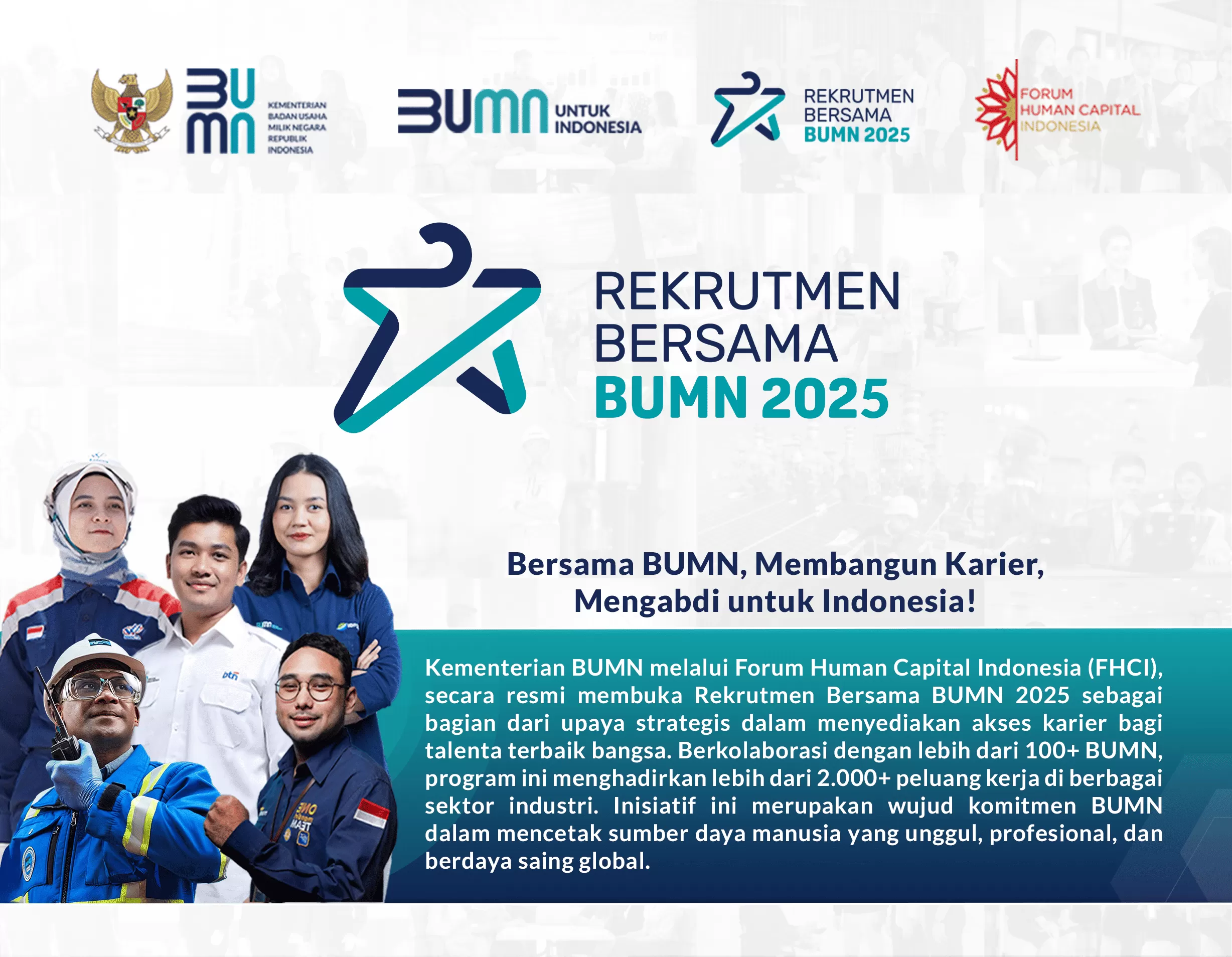 Informasi resmi mengenai Rekrutmen Bersama BUMN 2025 hanya dapat diperoleh melalui website resmi FHCI di www.fhcibumn.com dan akun Instagram Kementerian BUMN di @kementerianbumn & FHCI di @fhci.bumn.