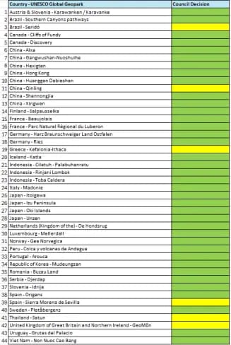 Jika Dewan Eksekutif UNESCO secara resmi mengadopsi permohonan yang telah diterima sejauh ini, jumlah total Geopark Global UNESCO akan meningkat dari 229 menjadi 241, di 51 negara. Jika disetujui, Tunisia akan mendapatkan Geopark Global UNESCO pertamanya.