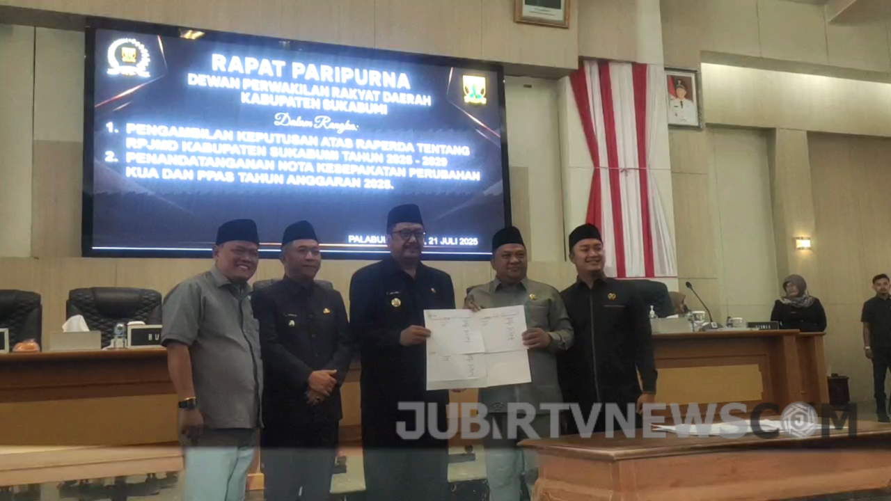 Kabupaten Sukabumi, jubirtvnews.com – Dewan Perwakilan Rakyat Daerah (DPRD) bersama Pemerintah Kabupaten Sukabumi resmi mengesahkan Raperda RPJMD Kabupaten Sukabumi tahun 2025–2029 dalam rapat paripurna yang digelar di Gedung DPRD, Komplek Perkantoran Jajaway, Pada Senin, 21 Juli 2025.