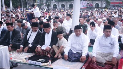JUBIRTVNEWS.COM – Bupati Sukabumi, Asep Japar didampingi Wakil Bupati Andreas serta unsur Forkopimda melaksanakan salat Idulfitri 1446 Hijriah/2025 Masehi di Masjid Agung Palabuhanratu, Senin (31/3/2025).