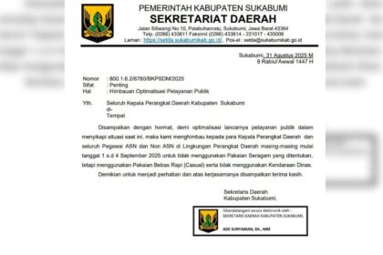 JUBIRTVNEWS.COM – Pemerintah Kabupaten Sukabumi mengeluarkan aturan baru terkait pakaian dinas dan penggunaan kendaraan operasional bagi aparatur sipil negara (ASN) maupun Non ASN. Melalui Surat Edara...